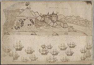 The location of Elmina made it a significant site for reprovisioning ships headed south towards the Cape of Good Hope on their way to India. After years of Portuguese wealth on the Elmina Coast, the Dutch learned of the profitable activity taking place through Barent Eriksz of Medemblik, one of the oldest traders and Guinea Navigators. Erickzen received information about trading on the Elmina coast while he was a prisoner on Principe and consequently was a major resource to the Dutch in terms of providing geographical and trading information.[6] The Dutch West India Company captured it in 1637; in subsequent centuries it was mostly used for the slave trade. The British attacked the city in 1782, but it remained in Dutch hands until 1872, when the Dutch Gold Coast was sold to the British. The king of Ashanti, claiming to be ground landlord, objected to its transfer, and the result was the third Anglo-Ashanti war of 1873–1874.[7]