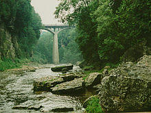 The Elora Gorge and its Conservation Area are at the edge of town. The park offers canoeing, paddleboat rentals, hiking, camp-grounds, fishing and picnicking.[35] Some of the limestone cliffs are 80 feet high. At the eastern end of the village is the Elora Quarry Conservation Area, a scenic former limestone quarry, and is now a popular swimming area.[36]