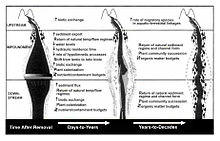 Removal of the dams on the Elwha River has been a long process. Physical removal started on September 27, 2011 and was completed August 26, 2014.[14][15] There is uncertainty about how the river will transform itself and what period of time will be involved. Because so few dam removal projects have been accompanied by scientific study, perhaps fewer than 20,[13] this project will be a model of the effectiveness of dam removal on this scale. If restoration of the river is successful, it could encourage a movement towards the restoration of natural stream morphology through the removal of larger dams. Most fish populations are expected to make a return to the river (Table 1). While fish may return to the river as soon as a year after the removal is complete,[13] it may take 15 to 20 years for the river to fully return to its pre-dam conditions.[5] The ultimate goal of the dam removal is restoring the river to a nearly pristine state.[15]