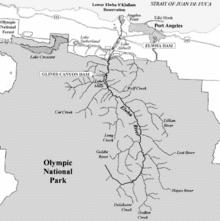 The Elwha Dam was a 108-ft (33 m) high dam located in the United States, in the state of Washington, on the Elwha River approximately 4.9 miles (7.9 km) upstream from the mouth of the river on the Strait of Juan de Fuca.