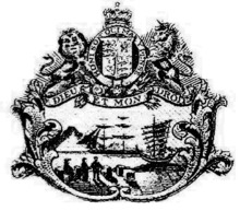 The colonial badge was in use since 1843 in one version or another until it was replaced by the coat of arms granted in 1959. Throughout several revisions, the idea of the badge remained. It depicted three merchants and a pile of cargo on a wharf on the left in the foreground. In the background there was a square-rigged ship and a Chinese junk in the harbour backed by conical hills. Above was the royal arms of the United Kingdom.