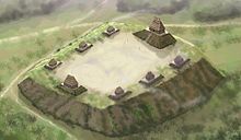 Emerald Mound was constructed during 1250 and 1600 CE, and is the type site for the Emerald Phase (1500 - 1680) of the Plaquemine culture Natchez Bluffs chronology. It was used as a ceremonial center for a population who resided in outlying villages and hamlets, but takes its name from the historic Emerald Plantation that surrounded the mound in the 19th century. The large mound began as a natural hill, which was built up by workers' depositing earth along the sides, reshaping it and creating an elongated, pentagonal-shaped, artificial plateau. Two smaller mounds sit on either end of the summit of the primary mound. The larger of the two sits at the western end, and measures 190 feet (58 m) by 160 feet (49 m) at the base and is 30 feet (9.1 m) in height.[6] The smaller mounds on the summit are believed to be platforms for homes of chiefs and other key leaders.[8]