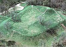 The summit of the mound is roughly 65 feet (20 m) above the surrounding landscape. Early drawings suggest that six smaller mounds, three on either side, flanked the edges of the primary mound[9] between the two secondary mounds, but were flattened by erosion and plowing in the 19th century. Originally a constructed ditch, part of the earthworks, encircled the entire complex.[8]