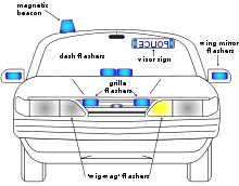 Emergency vehicle lighting is one or more visual warning lights fitted to a vehicle for use when the driver wishes to convey to other road users the urgency of their journey, to provide additional warning of a hazard when stationary, or in the case of law enforcement as a means of signalling another driver to stop for interaction with an officer. These lights may be dedicated emergency lights, such as a beacon or a light bar, or may be modified stock lighting, such as a wig-wag or hide-away light, and are additional to any standard lighting on the car such as hazard lights. Often, they are used along with a siren (or occasionally sirens) in order to increase their effectiveness.