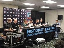 The series is also notable for its supporting cast—numerous known actors provided voices for a variety of recognizable villains, most notably Mark Hamill (previously famous for his role as Luke Skywalker in the original Star Wars trilogy) whose prominence as a voice actor was heightened through his "cheerfully deranged" portrayal of the Joker.[17] The role was originally given to Tim Curry, but he developed bronchitis during the initial recording sessions.[18] John Glover, who later voiced the Riddler, also auditioned for the Joker role. Hamill, who found himself to be the biggest fan of the Batman comics among the cast, credited the laughs he had honed on stage in Amadeus with landing him the role.[19] The recording sessions, under the supervision of voice director Andrea Romano, were recorded with the actors together in one studio instead of taking separate recordings, as is typical. This method would later be employed for all subsequent series in the DC Animated Universe. Al Pacino was considered to voice Two-Face in the series, but he declined the offer.[20] Richard Moll was instead cast in the role. Other actors included Ron Perlman as Clayface, Roddy McDowall as the Mad Hatter, David Warner as Ra's al Ghul, Michael York as Count Vertigo, Kate Mulgrew as Red Claw, George Murdock as Boss Biggis and George Dzundza as the Ventriloquist.