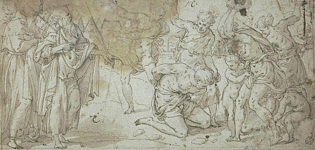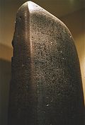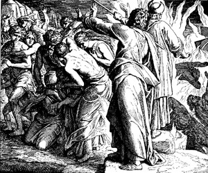 A man with an Israelite mother (from the tribe of Dan) and an Egyptian father got in a fight, and pronounced God's Name in blasphemy.[25] The people brought him to Moses and placed him in custody until God's decision should be made clear.[26] God told Moses to take the blasphemer outside the camp where all who heard him were to lay their hands upon his head, and the whole community was to stone him, and they did so.[27] God instructed that anyone who blasphemed God was to be put to death.[28] Anyone who murdered any human being was to be put to death.[29] One who killed a beast was to make restitution.[30] And anyone who maimed another person was to pay proportionately (in what has been called lex talionis).[31]