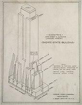 A structural steel contract was awarded on January 12, 1930,[85] with excavation of the site beginning ten days later on January 22,[86] before the old hotel had been completely demolished.[87] Two twelve-hour shifts, consisting of 300 men each, worked continuously to dig the 55-foot (17 m) foundation.[86] Small pier holes were sunk into the ground to house the concrete footings that would support the steelwork.[88] Excavation was nearly complete by early March,[89] and construction on the building itself started on March 17,[90][2] with the builders placing the first steel columns on the completed footings before the rest of the footings had been finished.[91] Around this time, Lamb held a press conference on the building plans. He described the reflective steel panels parallel to the windows, the large-block Indiana Limestone facade that was slightly more expensive than smaller bricks, and the building's vertical lines.[66] Four colossal columns, intended for installation in the center of the building site, were delivered; they would support a combined 10,000,000 pounds (4,500,000 kg) when the building was finished.[92]