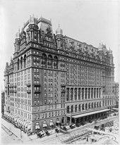 The site was previously owned by John Jacob Astor of the prominent Astor family, who had owned the site since the mid-1820s.[28][29] In 1893, John Jacob Astor Sr.'s grandson William Waldorf Astor opened the Waldorf Hotel on the site;[30][31] four years later, his cousin, John Jacob Astor IV, opened the 16-story Astoria Hotel on an adjacent site.[32][30][33] The two portions of the Waldorf–Astoria hotel had 1,300 bedrooms, making it the largest hotel in the world at the time.[34] After the death of its founding proprietor, George Boldt, in early 1918, the hotel lease was purchased by Thomas Coleman du Pont.[35][36] By the 1920s, the old Waldorf–Astoria was becoming dated and the elegant social life of New York had moved much farther north than 34th Street.[37][38][39] The Astor family decided to build a replacement hotel further uptown,[30] and sold the hotel to Bethlehem Engineering Corporation in 1928 for $14–16 million.[37] The hotel closed shortly thereafter, on May 3, 1929.[32]