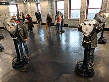 Aggressive marketing efforts served to reinforce the Empire State Building's status as the world's tallest.[149] The observatory was advertised in local newspapers as well as on railroad tickets.[150] The building became a popular tourist attraction, with one million people each paying one dollar to ride elevators to the observation decks in 1931.[151] In its first year of operation, the observation deck made approximately $2 million in revenue, as much as its owners made in rent that year.[139][126] By 1936, the observation deck was crowded on a daily basis, with food and drink available for purchase at the top,[152] and by 1944 the building had received its five-millionth visitor.[153] In 1931, NBC took up tenancy, leasing space on the 85th floor for radio broadcasts.[154][155] From the outset the building was in debt, losing $1 million per year by 1935. Real estate developer Seymour Durst recalled that the building was so underused in 1936 that there was no elevator service above the 45th floor, as the building above the 41st floor was empty except for the NBC offices and the Raskob/Du Pont offices on the 81st floor.[156]