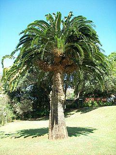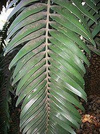 It is palm tree like, and can reach a height of 6 metres (20 ft). The trunk is about 30–50 centimetres (12–20 in) in diameter, thickest at the bottom, and topped by a crown of 50–150 leaves. The leaves are glossy and dark green, 150–250 centimetres (59–98 in) in length, and keeled with 70–150 leaflets, the leaflets falcate (sickle-shaped), 13–15 centimetres (5–6 in) long and 20–30 millimetres (0.8–1 in) broad.[4][5]