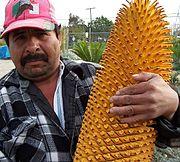 E. woodii is dioecious, meaning it has separate male and female plants, however no female plant has ever been discovered. The male strobili are cylindrical, 20–40 centimetres (7.9–16 in) long, exceptionally up to 120 centimetres (47 in), and 15–25 centimetres (6–10 in) in diameter; they are a vivid yellow-orange colour. A single plant may bear from around six to eight simultaneously.[4][5]