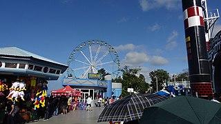 The rides and attractions of the park are scattered across seven themed zones.[5] The zones are Victoria Park, Portabello, Boulderville, Midway Boardwalk, Brooklyn Place, Spaceport, and Jungle Outpost. Victoria Park, which includes the main entrance, is patterned after the Victorian era. Boulderville is a small ride area for children which is similar to the fictional town of Bedrock from The Flintstones. Midway Boardwalk is based on 1930s Coney Island and features the most rides. Jungle Outpost is based on the Amazon Jungle in South America. Spaceport is dedicated to the Space Age. Brooklyn Place is based on 1940s New York and the silent film era. Finally, Portabello is based on the Caribbean/West Indies.[2]