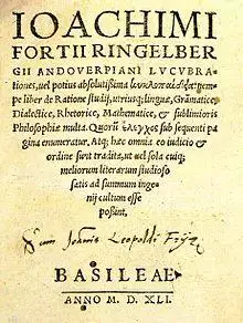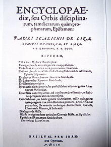 In the sixteenth century there was a level of ambiguity as to how to use this new word. As several titles illustrate, there was not a settled notion about its spelling nor its status as a noun. For example: Jacobus Philomusus's Margarita philosophica encyclopaediam exhibens (1508); Johannes Aventinus's Encyclopedia orbisque doctrinarum, hoc est omnium artium, scientiarum, ipsius philosophiae index ac divisio; Joachimus Fortius Ringelbergius's Lucubrationes vel potius absolutissima kyklopaideia (1538, 1541); Paul Skalich's Encyclopaediæ, seu orbis disciplinarum, tam sacrarum quam prophanarum, epistemon (1559); Gregor Reisch's Margarita philosophica (1503, retitled Encyclopaedia in 1583); and Samuel Eisenmenger's Cyclopaedia Paracelsica (1585).[16]