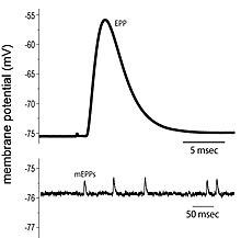 Miniature end plate potentials are the small (~0.4mV) depolarizations of the postsynaptic terminal caused by the release of a single vesicle into the synaptic cleft. Neurotransmitter vesicles containing acetylcholine collide spontaneously with the nerve terminal and release acetylcholine into the neuromuscular junction even without a signal from the axon. These small depolarizations are not enough to reach threshold and so an action potential in the postsynaptic membrane does not occur.[8] During experimentation with MEPPs, it was noticed that often spontaneous action potentials would occur, called end plate spikes in normal striated muscle without any stimulus. It was believed that these end plate spikes occurred as a result of injury or irritation of the muscles fibers due to the electrodes. Recent experiments have shown that these end plate spikes are actually caused by muscle spindles and have two distinct patterns: small and large. Small end plate spikes have a negative onset without signal propagation and large end plate spikes resemble motor unit potentials (MUPs). Muscle spindles are sensory receptors that measure muscle elongation or stretch and relay the information to the spinal cord or brain for the appropriate response.[9]