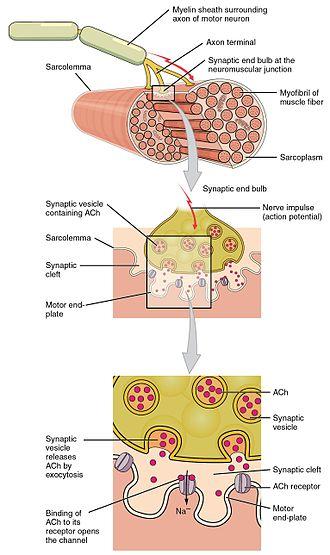 Normally the resting membrane potential of a motor neuron is kept at -70mV to -50 with a higher concentration of sodium outside and a higher concentration of potassium inside. When an action potential propagates down a nerve and reaches the axon terminal of the motor neuron, the change in membrane voltage causes the calcium voltage gated ion channels to open allowing for an influx of calcium ions. These calcium ions cause the acetylcholine vesicles attached to the presynaptic membrane to release acetylcholine via exocytosis into the synaptic cleft.[3]