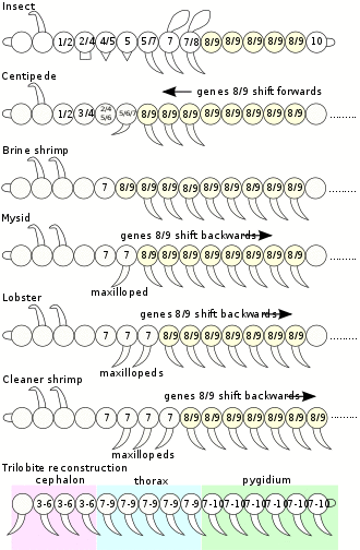 Expression of Hox genes in the body segments of different groups of arthropod, as traced by evolutionary developmental biology. The Hox genes 7, 8, and 9 correspond in these groups but are shifted (by heterochrony) by up to three segments. Segments with maxillopeds have Hox gene 7. Fossil trilobites probably had three body regions, each with a unique combination of Hox genes.