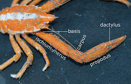 The leg of a squat lobster, showing the segments; the ischium and merus are fused in many decapods.