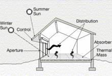 In passive solar building design, windows, walls, and floors are made to collect, store, and distribute solar energy in the form of heat in the winter and reject solar heat in the summer. This is called passive solar design or climatic design because, unlike active solar heating systems, it does not involve the use of mechanical and electrical devices.