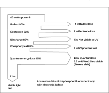 With the exception of a few light sources, such as incandescent light bulbs, most light sources have multiple stages of energy conversion between the "wall plug" (electrical input point, which may include batteries, direct wiring, or other sources) and the final light-output, with each stage producing a loss. Low-pressure sodium lamps initially convert the electrical energy using an electrical ballast, to maintain the proper current and voltage, but some energy is lost in the ballast. Similarly, fluorescent lamps also convert the electricity using a ballast (electronic efficiency). The electricity is then converted into light energy by the electrical arc (electrode efficiency and discharge efficiency). The light is then transferred to a fluorescent coating that only absorbs suitable wavelengths, with some losses of those wavelengths due to reflection off and transmission through the coating (transfer efficiency). The number of photons absorbed by the coating will not match the number then reemitted as fluorescence (quantum efficiency). Finally, due to the phenomenon of the Stokes shift, the re-emitted photons will have a longer wavelength (thus lower energy) than the absorbed photons (fluorescence efficiency). In very similar fashion, lasers also experience many stages of conversion between the wall plug and the output aperture. The terms "wall-plug efficiency" or "energy conversion efficiency" are therefore used to denote the overall efficiency of the energy-conversion device, deducting the losses from each stage, although this may exclude external components needed to operate some devices, such as coolant pumps.[6][7]