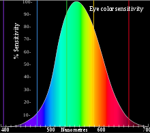 The wall-plug efficiency differs from the luminous efficiency in that wall-plug efficiency describes the direct output/input conversion of energy (the amount of work that can be performed) whereas luminous efficiency takes into account the human eye's varying sensitivity to different wavelengths (how well it can illuminate a space). Instead of using watts, the power of a light source to produce wavelengths proportional to human perception is measured in lumens. The human eye is most sensitive to wavelengths of 555 nanometers (greenish-yellow) but the sensitivity decreases dramatically to either side of this wavelength, following a Gaussian power-curve and dropping to zero sensitivity at the red and violet ends of the spectrum. Due to this the eye does not usually see all of the wavelengths emitted by a particular light-source, nor does it see all of the wavelengths within the visual spectrum equally. Yellow and green, for example, make up more than 50% of what the eye perceives as being white, even though in terms of radiant energy white-light is made from equal portions of all colors (i.e.: a 5 mw green laser appears brighter than a 5 mw red laser, yet the red laser stands-out better against a white background). Therefore, the radiant intensity of a light source may be much greater than its luminous intensity, meaning that the source emits more energy than the eye can use. Likewise, the lamp's wall-plug efficiency is usually greater than its luminous efficiency. The effectiveness of a light source to convert electrical energy into wavelengths of visible light, in proportion to the sensitivity of the human eye, is referred to as luminous efficacy, which is measured in units of lumens per watt (lm/w) of electrical input-energy.