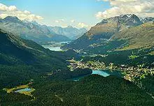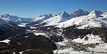- The Upper Engadine, from Maloja Pass to the dell near Brail,[4] in the west, where the valley stays fairly flat and is remarkably wide (up to 1.5 km (0.93 mi)) as far as S-chanf. Its major center is St. Moritz and very bustling during touristic peak seasons, winter and summer. The traditionally spoken Romansh idiom in the Upper Engadine is called Putèr.[4]