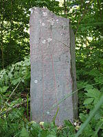 This secluded runestone is located in a grove near Väsby, Uppland, Sweden. It was raised by a Viking in commemoration of his receiving one danegeld in England. It is classified as being carved in runestone style Pr3 and, together with U 344, it has been said to be the earliest example of an Urnes style inscription in Uppland.[5] The runic text follows a common rule to only carve a single rune for two consecutive letters, even when the letters were at the end of one word and the beginning of a second word.[6] When the text shown as Latin characters, the transliterated runes are doubled and separate words are shown. For U 194 has three examples where this occurred, þinoftiʀ is transliterated as þino| |oftiʀ, tuknuts as tuk| |knuts, and anklanti as a| |anklanti.
