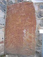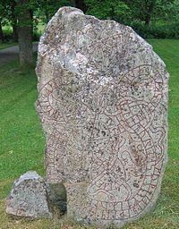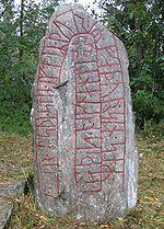 This runestone which is located in Grinda is in the style RAK. It is raised in memory of a father who divided up gold in England and attacked some towns in northern Germany. According to Omeljan Pritsak, the gold which was divided was part of the danegeld,[31] and Erik Brate argues that it was the same expedition as the one mentioned on the Berga Runestone.[32]