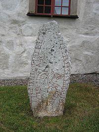This runestone is located at the church of Husby-Sjuhundra. It is one of the older runestones as it is in the style RAK. It is raised in memory of Sveinn who intended to go to England but died en route in Jutland. Omeljan Pritsak comments that Sveinn probably died in the Limfjord, Jutland, as the fjord was usually the starting point for campaigns against England.[15] Jansson dates Svein's death to 1015, when Canute the Great's great invasion fleet had been assembled in the Limfjord, a fleet that had many young warriors from Uppland.[16] When the fleet departed for England, Sveinn was no longer aboard.[16]