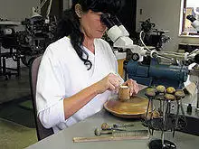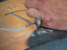 Each graver is different and has its own use. Engravers use a hardened steel tool called a burin, or graver, to cut the design into the surface, most traditionally a copper plate.[1] However, modern hand engraving artists use burins or gravers to cut a variety of metals such as silver, nickel, steel, brass, gold, titanium, and more, in applications from weaponry to jewellery to motorcycles to found objects. Modern professional engravers can engrave with a resolution of up to 40 lines per mm in high grade work creating game scenes and scrollwork. Dies used in mass production of molded parts are sometimes hand engraved to add special touches or certain information such as part numbers.