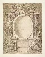 Preparatory drawing by Hans von Aachen for a print with effigy of Emperor Rudolph II, National Library of Poland[2] and Aegidius Sadeler's print from 1603, Metropolitan Museum of Art.