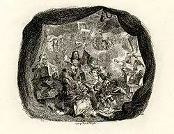 Battle of Engravers, satirical etching by George Cruikshank, showing hypothetical battle between the engravers, including William Hogarth, Antoine Masson, William Woollett, Jean-Joseph Balechou, Albrecht Dürer and Marcantonio Raimondi.