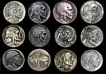 Modifying the relief designs on coins is a craft dating back to the 18th century and today modified coins are known colloquially as hobo nickels. In the United States, especially during the Great Depression, coin engraving on the large-faced Indian Head nickel became a way to help make ends meet. The craft continues today, and with modern equipment often produces stunning miniature sculptural artworks and floral scrollwork.[7]