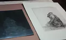 Modern impression of Rembrandt's 1639 self-portrait, with the engraving plate.