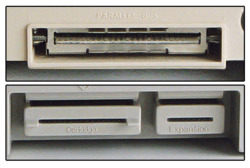 The Enhanced Cartridge Interface, or ECI, was a modified version of the PBI designed to be smaller and less expensive to implement. Many of the pins in the PBI were duplicated in the 30-pin cartridge slot, so ECI was limited to only those 14 pins in the PBI that were not in the cartridge slot. Placed side-by-side on the back of the computer, devices plugged into both at the same time to provide the same electrical interface as the PBI. The ECI was found on the 65XE (late production units only), the 130XE and the 800XE.