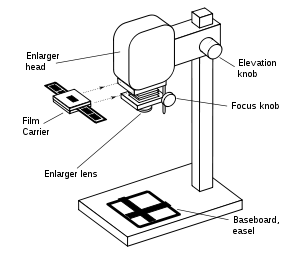 The enlargement is made by first focusing the image with the lamp on, the lens at maximum aperture and the easel empty, usually with the aid of a focus finder. The lamp is turned off, or in some cases, shuttered by a light-tight mechanism.