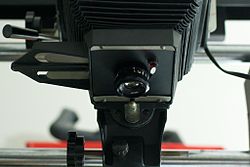 An unfrosted clear lamp with a tiny filament is used without diffusers.[11] As the illuminant is narrow the lamp must be precisely positioned both vertically and horizontally, because the condensers project only that single small filament rather than light that fills the whole housing. However the lens must be kept at full aperture to avoid projecting an image of the light source restricted to the centre of the baseboard, which will cause vignetting and falloff in the print. Exposure is controlled through duration or using a variable transformer.