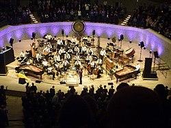Ensemble Modern was founded in 1980 by members of the Junge Deutsche Philharmonie. From the beginning, the ensemble chose to organize itself democratically. There is no artistic director or chief conductor; instead, all projects, productions and financial matters are decided and supported by the musicians directly.[1][2] Currently, the ensemble combines 19 soloists from different backgrounds: Belgium, Bulgaria, Germany, Greece, India, Israel, Japan, Switzerland, and the United States.[3]