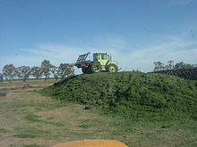 Silage (/ˈsaɪlɪdʒ/[1]) is a type of fodder made from green foliage crops which have been preserved by acidification, achieved through fermentation. It can be fed to cattle, sheep and other such ruminants (cud-chewing animals).[2] The fermentation and storage process is called ensilage, ensiling or silaging, and is usually made from grass crops, including maize, sorghum or other cereals, using the entire green plant (not just the grain). Silage can be made from many field crops, and special terms may be used depending on type: oatlage for oats, haylage for alfalfa (haylage may also refer to high dry matter silage made from hay).[3]
