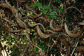 Entada rheedii, commonly known as African dream herb or snuff box sea bean,[3] and as the cacoon vine in Jamaica, is a large woody liana or climber. Their seeds have a thick and durable seed coat which allows them to survive lengthy periods of immersion in seawater.