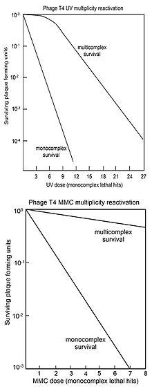 MR is usually represented by "survival curves" where survival of plaque forming ability of multiply infected cells (multicomplexes) is plotted against dose of genome damaging agent. For comparison, the survival of virus plaque forming ability of singly infected cells (monocomplexes) is also plotted against dose of genome damaging agent. The top figure shows the survival curves for virus T4 multicomplexes and monocomplexes with increasing dose of UV light. Since survival is plotted on a log scale it is clear that survival of multicomplexes exceeds that of monocomplexes by very large factors (depending on dose). The UV inactivation curve for multicomplexes has an initial shoulder. Other virus T4 DNA damaging agents with shoulders in their multicomplex survival curves are X-rays[34][35] and ethyl methane sulfonate (EMS).[28] The presence of a shoulder has been interpreted to mean that two recombinational processes are used.[36] The first one repairs DNA with high efficiency (in the "shoulder"), but is saturated in its ability as damage increases; the second pathway functions at all levels of damage. Surviving T4 virus released from multicomplexes show no increase in mutation, indicating that MR of UV irradiated virus is an accurate process.[36]