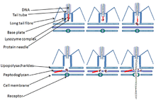 The T4 virus initiates an Escherichia coli infection by binding OmpC porin proteins and lipopolysaccharide (LPS) on the surface of E. coli cells with its long tail fibers (LTF).[16][17] A recognition signal is sent through the LTFs to the baseplate. This unravels the short tail fibers (STF) that bind irreversibly to the E. coli cell surface. The baseplate changes conformation and the tail sheath contracts, causing GP5 at the end of the tail tube to puncture the outer membrane of the cell.[18] The lysozyme domain of GP5 is activated and degrades the periplasmic peptidoglycan layer. The remaining part of the membrane is degraded and then DNA from the head of the virus can travel through the tail tube and enter the E. coli cell.