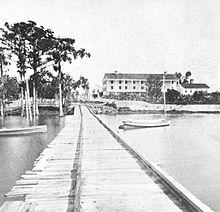The South Atlantic Blockading Squadron division commanded by Union Captain George Balch set out to capture Confederate steamboats on the St. Johns River. Seized at Lake Monroe on March 14, 1864, was the Hattie Brock, named for the captain's daughter, and loaded with 150 bales of cotton for export to help finance the rebel cause. It was towed to Brock's wharf to load wood fuel. From the veranda of The Brock House, the New York Tribune would report, Miss Brock expressed grief and indignation at the capture of her namesake by the Yankees. The marines were reportedly glad to get away as soon as their boats were supplied. They took with them from Enterprise two black males, probably slaves, and three black females, as well as 2,000 pounds of sugar from a refinery. They demolished the mill, located about 2 miles (3.2 km) farther downriver on the east side of DeBary Creek.