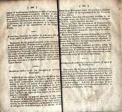 "From a Kentucky paper we have copied an account of the detention of the steamboat Dispatch, and the interruption she met with in New Orleans. We have endeavored to see Captain Bruce since his arrival, in order to obtain more correct information on the subject, but have not had the good fortune to meet with him. We conceive the act of the legislature under which Mr. Livingston has proceeded in this business, as an infamous violation of the constitutional privileges of the citizens of all states lying on the great Western waters. We know not what construction the above act will receive from the courts at Orleans. But it is much better to trust to our own power of retaliation than to the justice of courts two thousand miles from us. If the system of oppression under which Captain Bruce has suffered, is to be continued, it is to be hoped that the powerful State of Pennsylvania will not submit to a legalized system of plunder and robbery, maintained by the State of Louisiana. It is to be presumed that she will rise in the majesty of her strength, pass retaliatory acts, and subject to attachments and seizure, not the vessels merely which may belong to its citizens. This would be an act of vengeance worthy of her; and if this should not be able to put a stop to the impudent pretensions of the new State to an exclusive jurisdiction over the navigation of the waters within her boundaries, force must!" - ^ Slaughter, Gabriel (1817). Acts passed at the first session of the twenty-fifth general assembly, for the commonwealth of Kentucky. Frankfort, Kentucky: Gerard and Kendall, pp. 280-1: