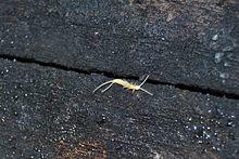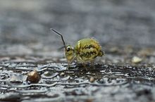 The Entognatha are a class of wingless and ametabolous arthropods, which, together with the insects, makes up the subphylum Hexapoda.[1][2] Their mouthparts are entognathous, meaning that they are retracted within the head.[1] Entognatha are apterous, meaning that they lack wings. The class contains three orders: Collembola (springtails), Diplura (“two-tail”) and Protura (“first-tail”), and over 5000 known species.[1][2] These three groups were historically united with the now-obsolete order Thysanura to form the class Apterygota, but it has since been recognized that the hexapodous condition of these animals has evolved independently from that of insects, and independently within each order.[3] The orders may not be closely related, and Entognatha is now considered to be a polyphyletic group.[2]