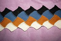 For garments and projects requiring square edges, the entrelac is ringed in triangles, knit in the same way as the squares but with increases and decreases. A row of triangles is the typical starting point for an entrelac project, though they can also be started with connected squares, as in the scarf to the left, which was knit from side to side starting with the white row.