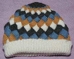 Unlike many textured knitting techniques, Entrelac allows for colorwork as well. Though single-color entrelac is the norm, it is often used to create colored patterns. The use of variegated yarn with long color repeats for entrelac has become commonplace, since careful use can create distinct squares of color with only one yarn. Entrelac can be knit flat (back-and-forth) or in the round for a cylinder, as for the hat at right. However, unlike typical round knitting, the knitting is turned after a full round of squares so the next set is knitted in the opposite direction.