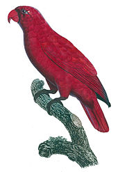 | Red lory (Eos bornea) | 31 cm (12 in) long. Mostly red and upper body is all red. Red, blue and black markings on back and wings.[2] | Several subspecies on islands from South Moluccas to Kai Islands, Indonesia[2][18] | |