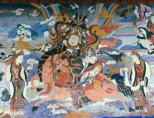 Until recently, the tale was forbidden reading in many Tibetan monasteries.[33] In some monasteries, however, rituals invoking Gesar as a major spiritual force are performed.[2] Given the central role the epic played over the centuries in Tibetan folk culture, Tibetan Buddhism has incorporated elements from it and interpreted them in religious terms. The Gelug school disapproved of the epic, while the Kagyu and Nyingma schools generally favoured it, seeing it as an expression of the activity of Padmasambhava and as a vehicle for Buddhist teachings, especially of the Dzogchen school.[52] Consequentially, the question of whether babdrung (visionary Gesar bards) should be regarded as religious practitioners (Wylie: chos pa) will be answered differently by those who favor and those who oppose the epic; the babdrung themselves, however, generally emphasize the connection of the epic with the Dharma (Wylie: chos, THL: chö) and see themselves as a kind of religious practitioner.[52]