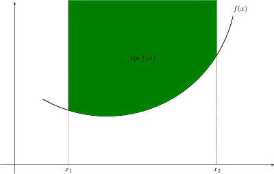 Despite the fact that might take one (or both) of as a value (in which case its graph would not be a subset of ), the epigraph of is nevertheless defined to be a subset of rather than of This is intentional because when is a vector space then so is but is never a vector space.[2] The epigraph being a subset of a vector space allows for tools related to real analysis and functional analysis (and other fields) to be more readily applied.