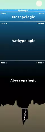The ocean can be divided into depth layers depending on the amount of light penetration, as discussed in pelagic zone. The upper 200 metres is referred to as the photic or euphotic zone. This represents the region where enough light can penetrate to support photosynthesis, and it corresponds to the epipelagic zone. From 200 to 1000 metres lies the dysphotic zone, or the twilight zone (corresponding with the mesopelagic zone). There is still some light at these depths, but not enough to support photosynthesis. Below 1000 metres is the aphotic (or midnight) zone, where no light penetrates. This region includes the majority of the ocean volume, which exists in complete darkness.[9]